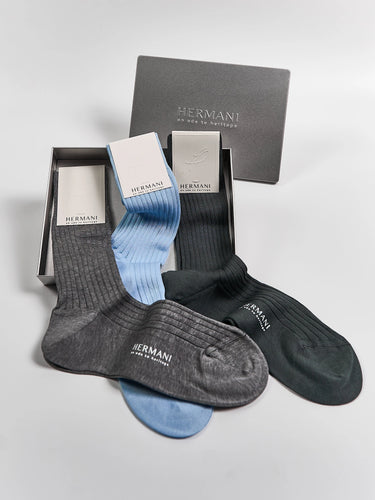 This three-pair gift set is part of our luxury essentials collection and perfectly complements the tasteful attire, both in formal and casual settings. It is the perfect present for a sophisticated sock drawer update and comes in our signature Hermani gift box.