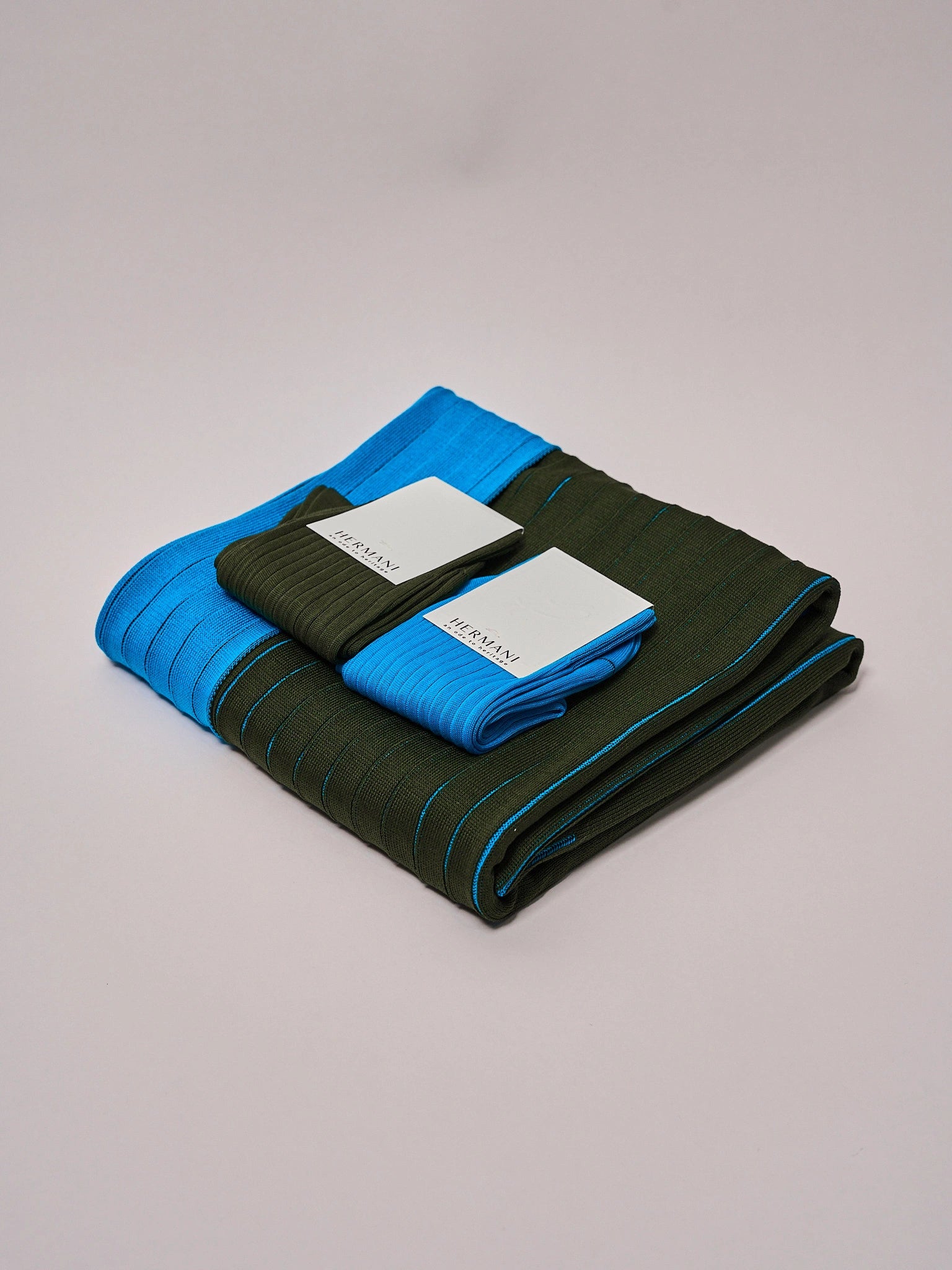 The Oliva/Acqua Colour Ensemble pairs our Egyptian cotton scarf with two complimentary Filo di Scozia socks in oliva and acqua.