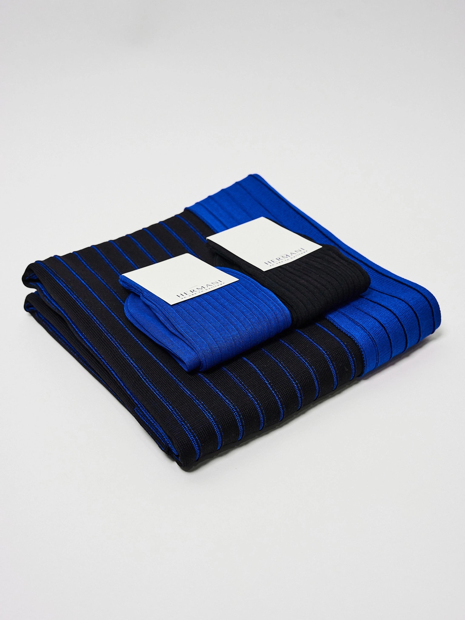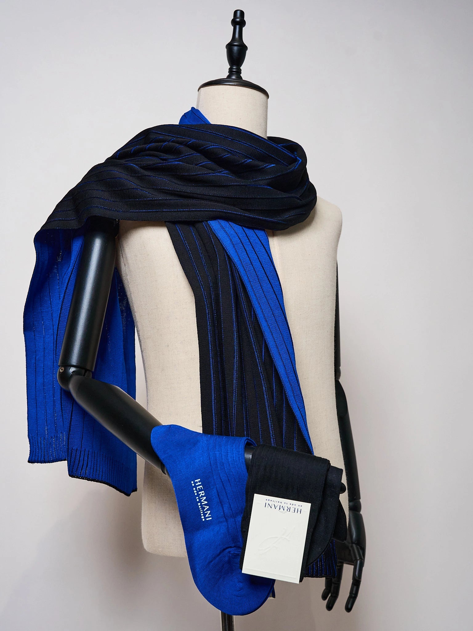 The Zaffiro/Nero Colour Ensemble combines our Egyptian cotton scarf with two complimentary Filo di Scozia socks in zaffiro and nero - a modern expression of minimalism.